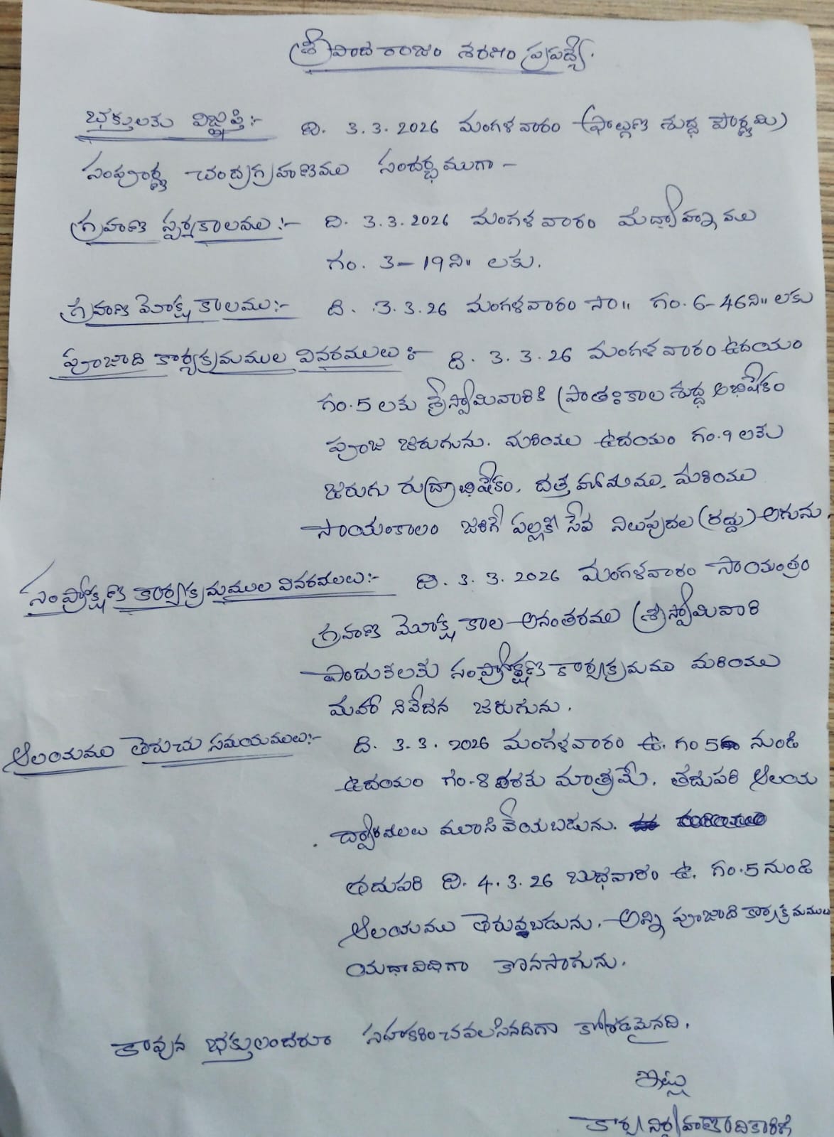 IMP Notice on Lunar Eclipse: Temple will remain closed from 08:00AM, 03-March-2026 on the occation of Lunar Eclipse, and reopened for darshanam on 05:00AM of 04-March-2026.